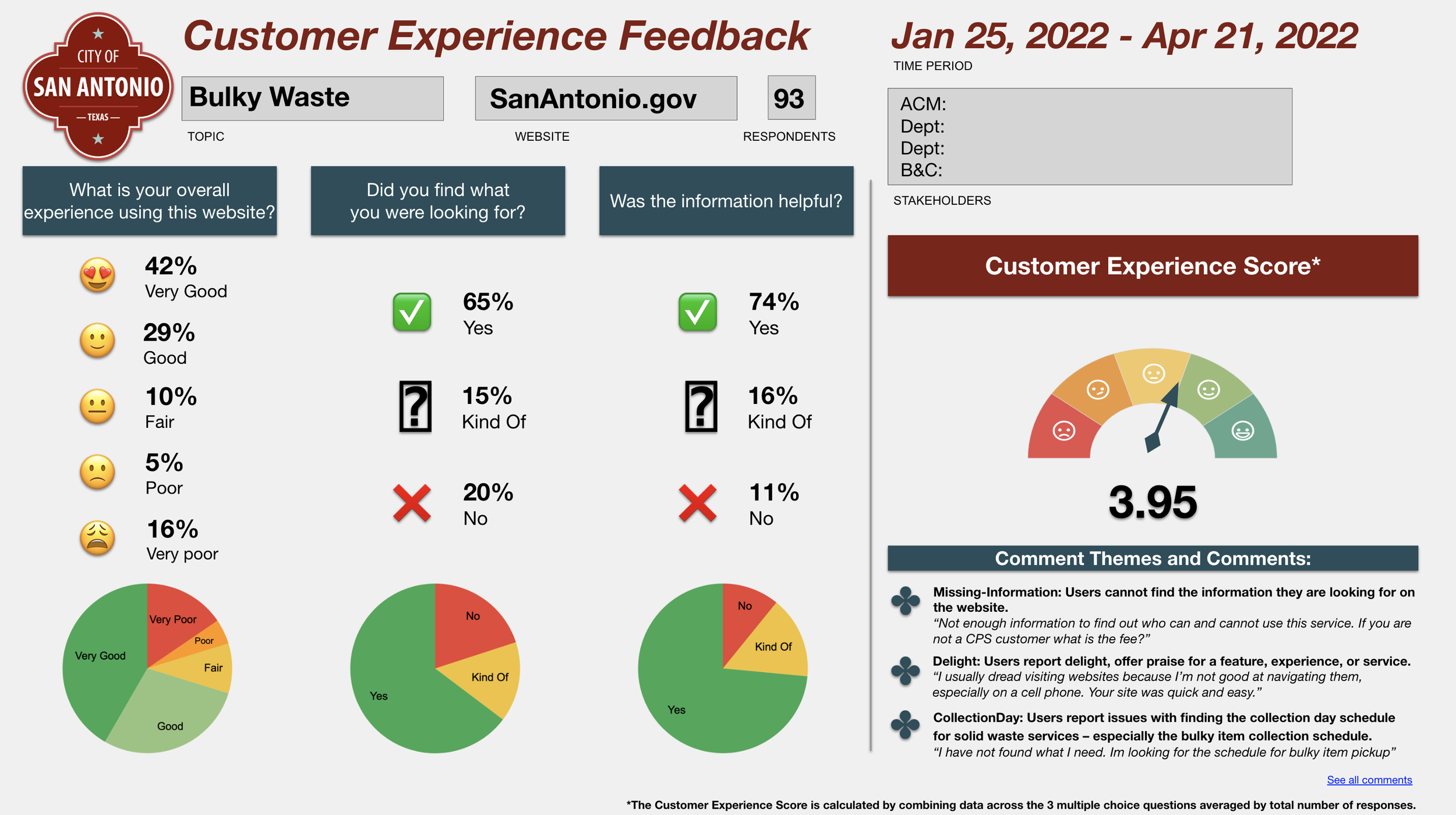 The COSA Web Team asked Firecat Studio to analyze user feedback collected through short surveys embedded across various landing pages on SA.gov and SanAntonio.gov. The goal was to develop a repeatable methodology for processing survey results and calculating baseline experience scores, both by topic and at the site level, that could help track progress as the city transitioned from its legacy site to a new platform.